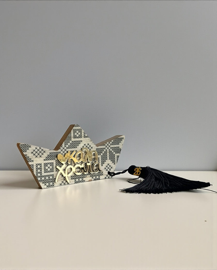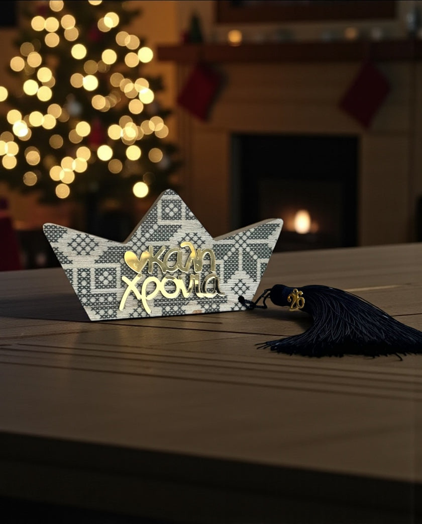 Γούρι Ξύλινο Καράβι με Κέντημα "Καλή Χρονιά" Επιτραπέζιο